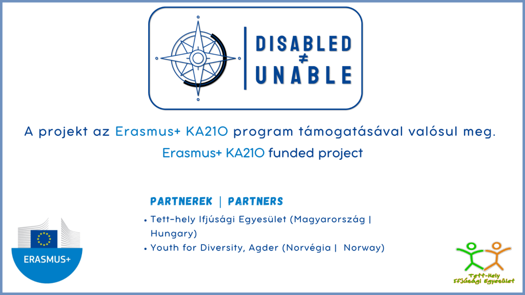 The aim of our project is to promote the participation of young people with disabilities in international mobility programmes. The project is implemented by us – Tett-Hely Youth Association in Hungary, and our Norwegian partner – Youth for Diversity Agder. In both countries, different activities are carried out simultaneously, and we also work together in the framework of project meetings, trying to meet institutions that directly deal with young people with disabilities. In this way, we, as youth international mobility organisations and local organisations working with young people with disabilities, strive to create common information materials and professional assistance to help organisations and young people to find each other and participate more in the programme.